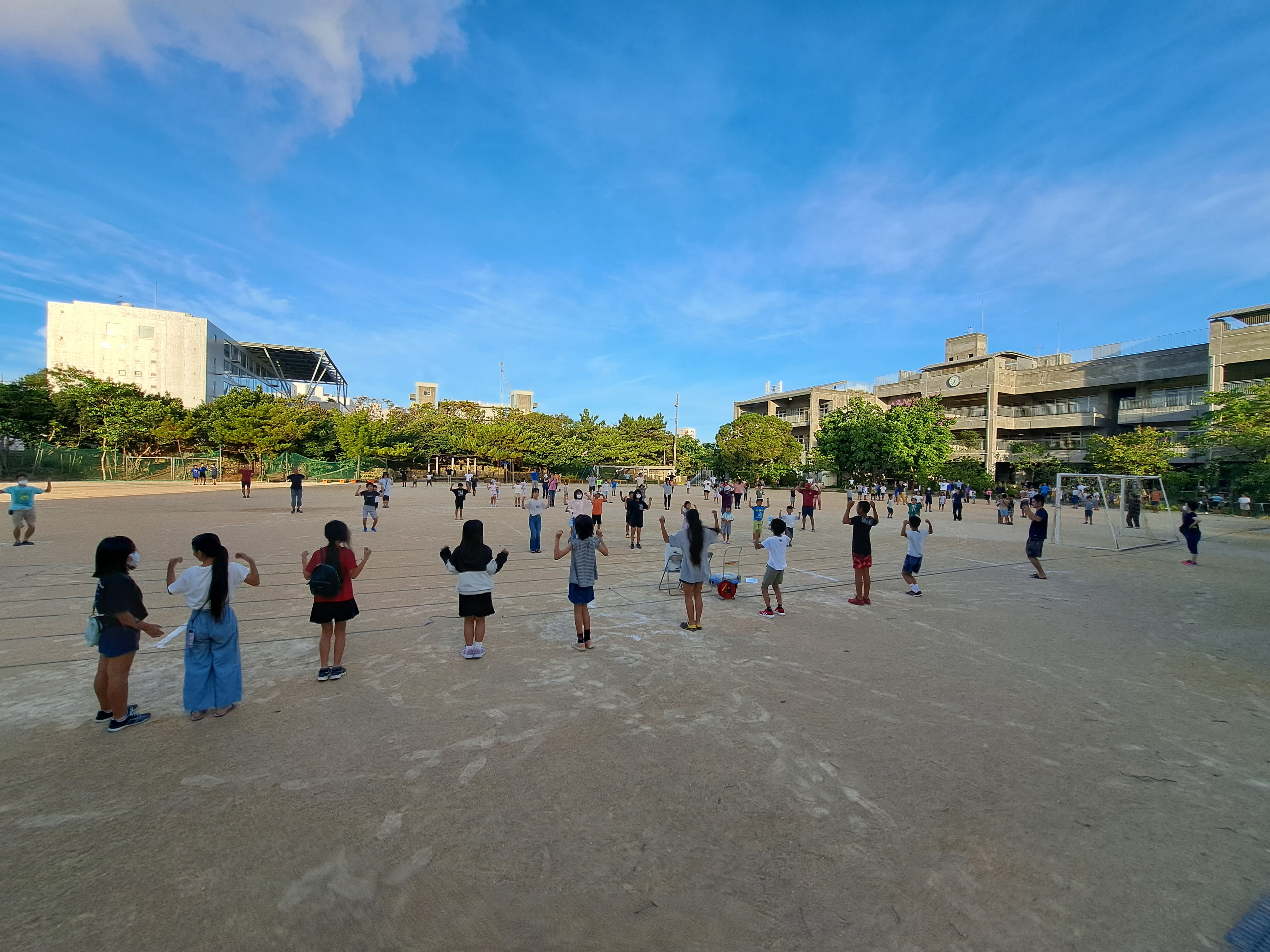 夏休みラジオ体操やっています誰でも自由に参加OKです!(朝6時半、銘苅小学校運動場、土日雨天時休み、写真参照)